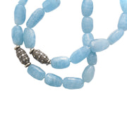 A strand of faceted barrel shape Aqua Necklace with an antique finish silver / 18 karat white gold plunger clasp decorated with rose-cut diamonds. Signed Sorab & Roshi.
