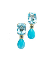 Faceted emerald cut Blue topaz Earrings with tear shape Turquoise drops topped with blue sapphire. Set in 18 karat yellow gold, signed Sorab & Roshi.