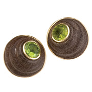 Walnut wood cone shape Earrings with a round faceted Peridot center. Set in 18 karat yellow gold, signed Sorab & Roshi.