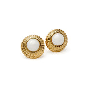 Etched 18 karat yellow gold Earrings with a round white Coral center. Signed Sorab & Roshi.
